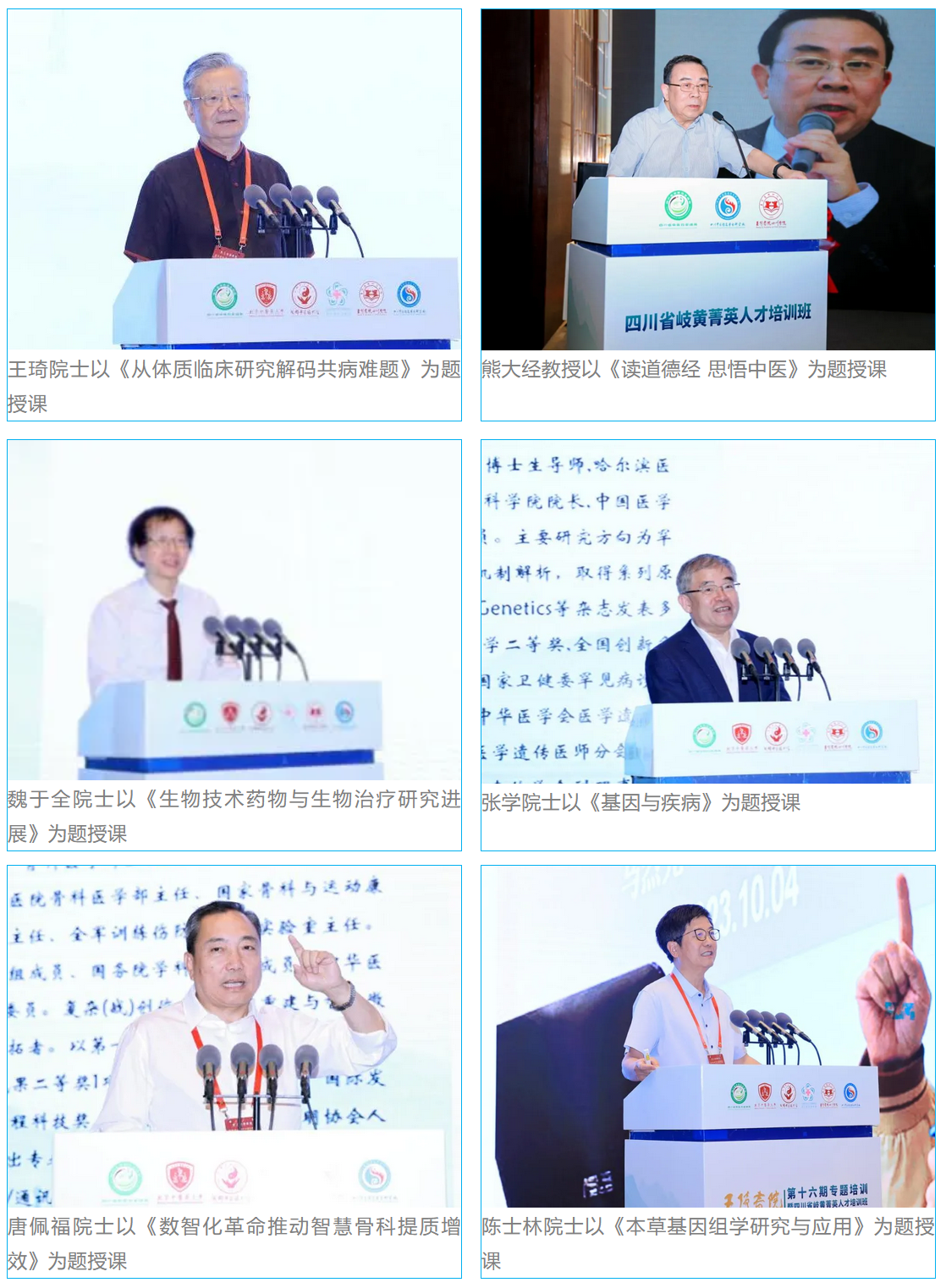 中国工程院院士、国医大师王琦,全国名中医熊大经,中国科学院院士魏于全,中国工程院院士张学、唐佩福、陈士林等全国知名专家为学员授课,授课内容涵盖中医药现代化、中医临床诊疗和中医药思维体系等,来自全省中医药系统及四川大学华西医院、四川农业大学等单位的125位岐黄菁英人才参加培训。
